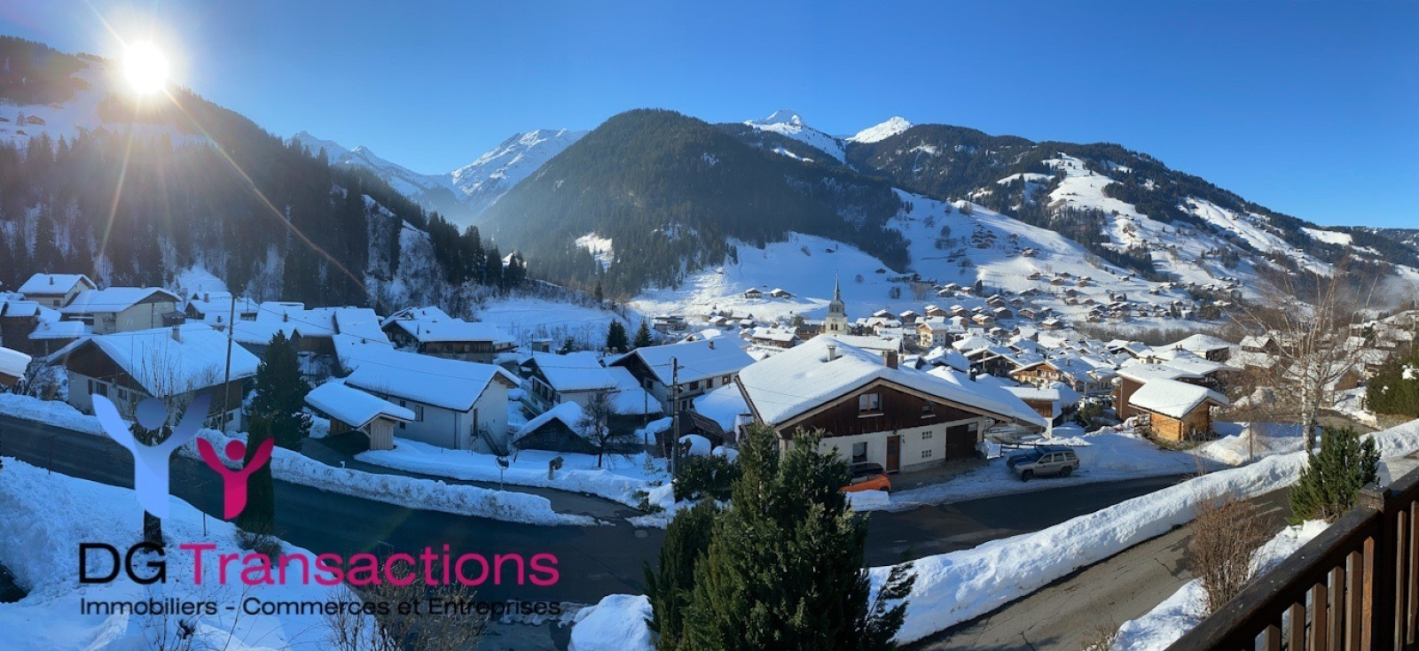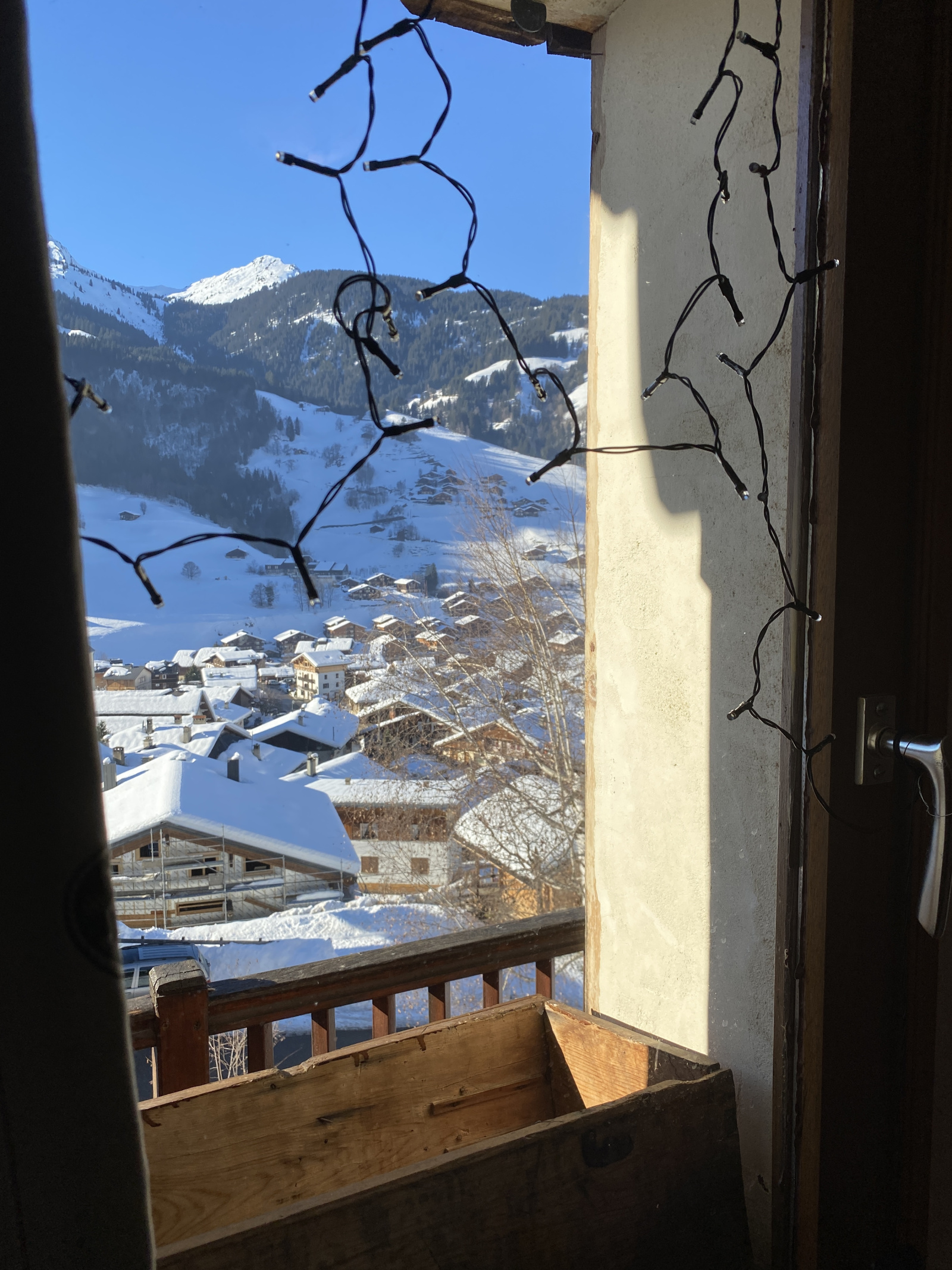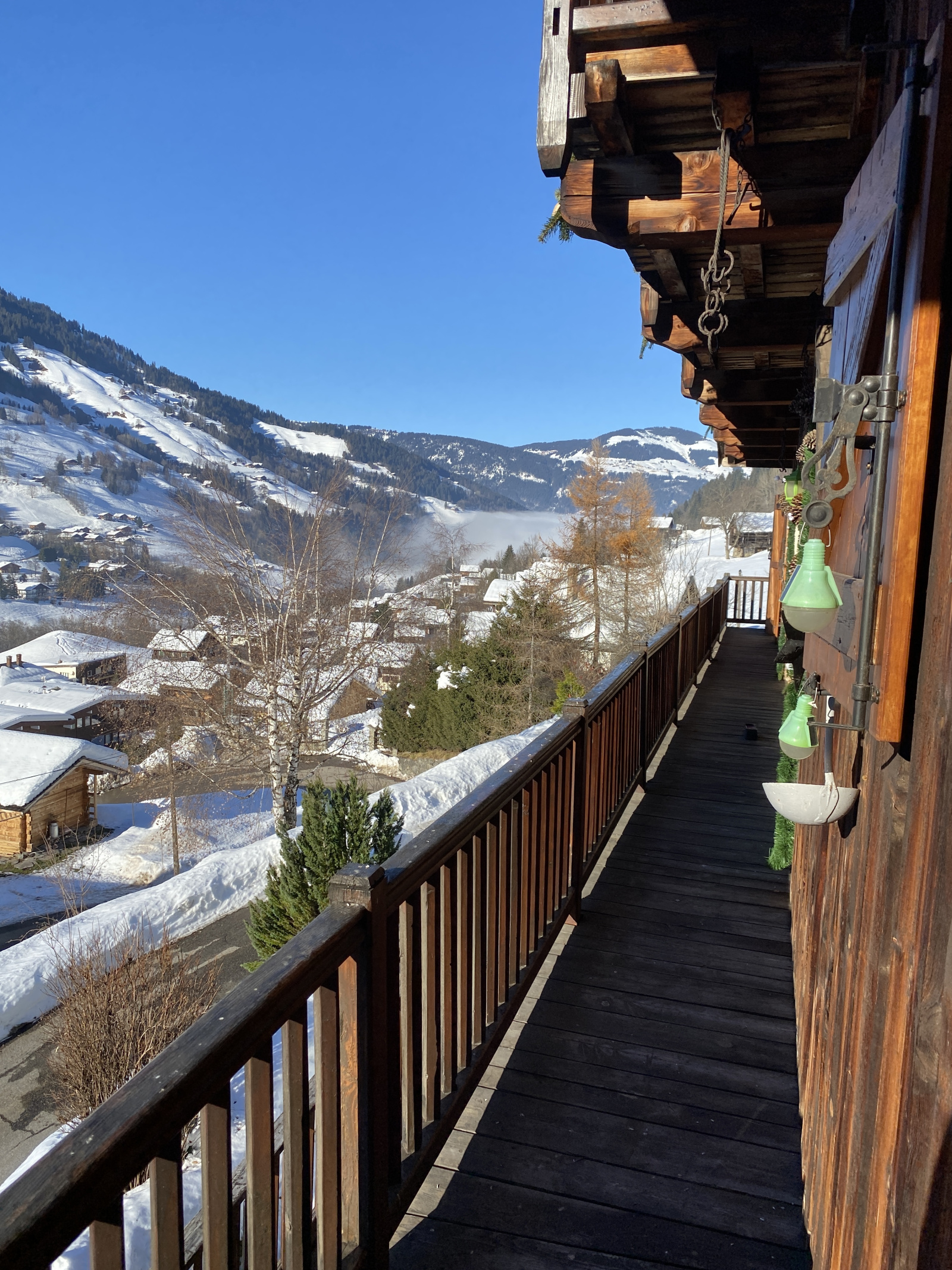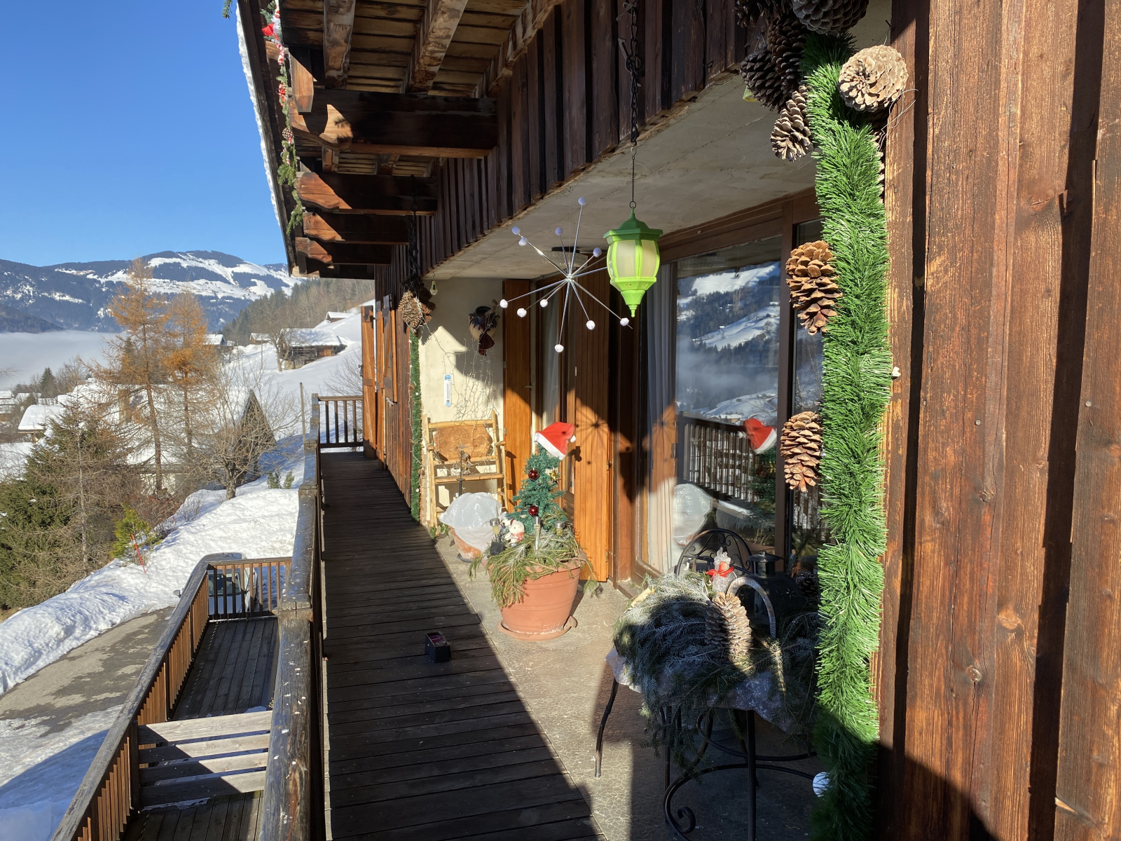 Le balcon terrasse orienté sud-est offre une vue imprenable sur le village et les sommets environnants.